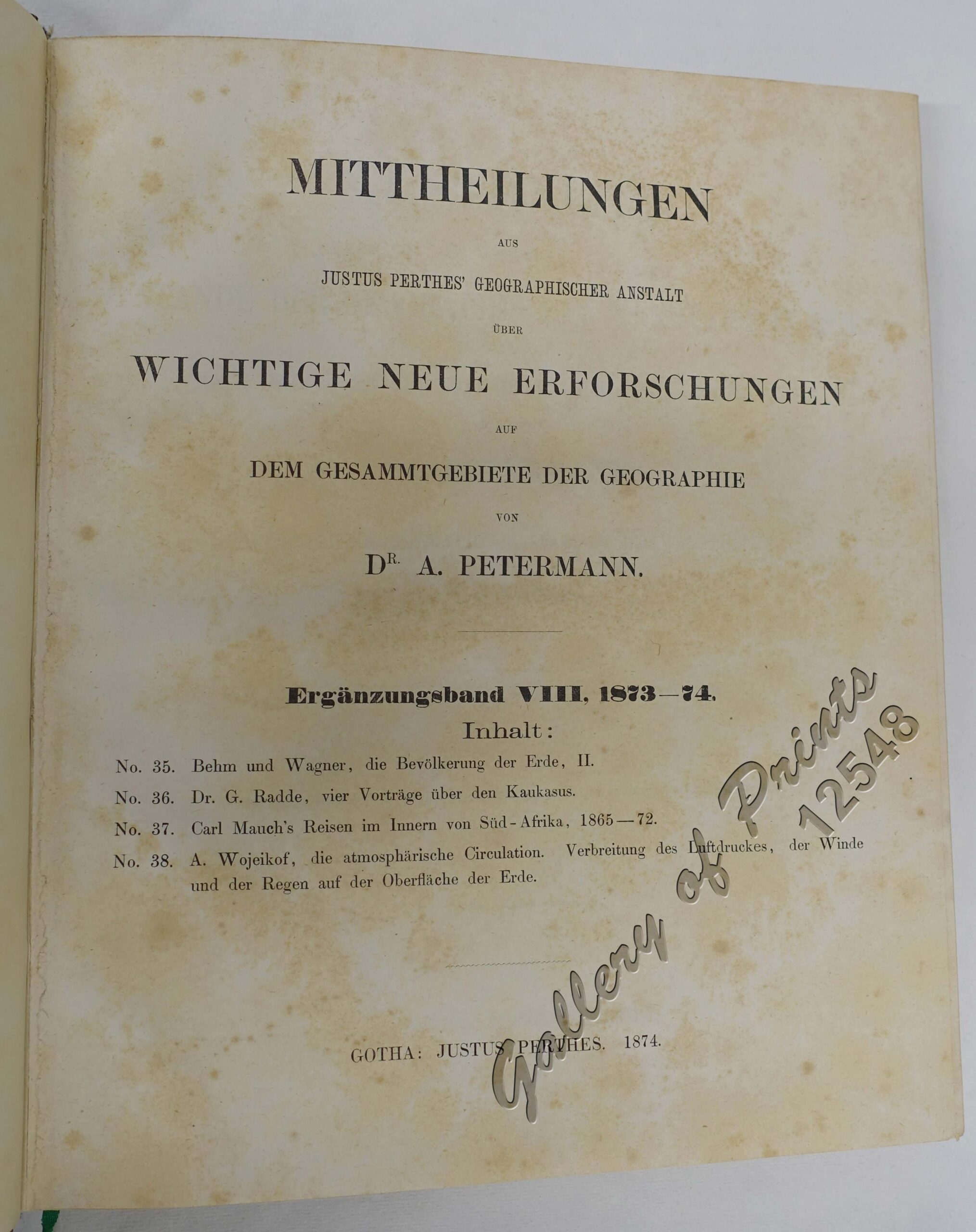![Mittheilungen aus Justus Perthes' Geographischer Anstalt. über wichtige neue Erforschungen auf dem Gesammtgebiete der Geographie von Dr. A. Petermann. - Ergänzungsband VIII, 1873-74 Inhalt: [Supplement Vol. 8 contents] No. 35. Behm und Wagner, die Bevölkerung der Erde, II. No. 36. Dr. G. Radde, vier Vorträge über den Kaukasus. No. 37. Carl Mauch's Reisen im Innern von Süd-Afrika, 1865-72. No. 38. A. Wojeikof, die atmosphärische Circulation. Verbreitung des Luftdruckes, der Winde und der Regen auf der Oberfläche der Erde. - Image 2](https://galleryofprints.shop/wp-content/uploads/2022/03/jo12548-Petermann-1860-Mittheilungen-aus-Justus-Perthes-Geographischer-Anstalt-volume-8-front-scaled.jpg)