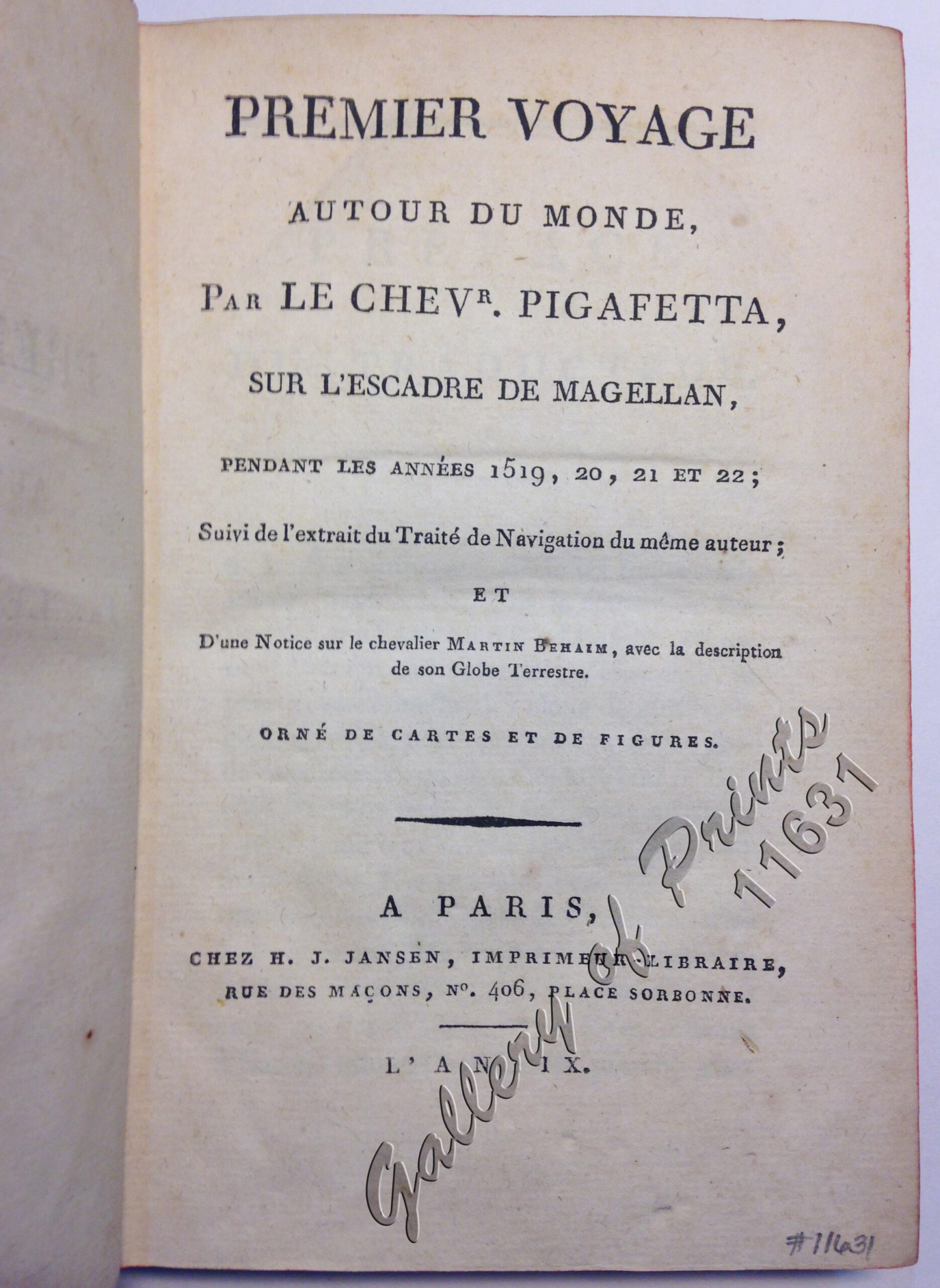 with 3 engraved plates and 7 engraved maps (4 coloured, 3 folding). EXTREMELY RARE. First French edition of a manuscript supposed to be Pigafetta’s (c1491-1531)original travel narrative, discovered by Father Carlo Amoretti in the Ambrosiana in 1800, edited in Italian and also translated by him into French. Pigafetta’s is the only account of Magellan’s tour around the world and is particularly valuable for its early descriptions of the Philippines, Moluccas and the Malay Archipelago. He witnessed Magellan’s death in Mactan in 1521 and was one of only 18 men who completed the circumnavigation and directly returned to Spain. Partly copied from the original manuscript and including large maps of the travel route, the Philippines & Moluccas, and of part of the Martin Behaim Globe.