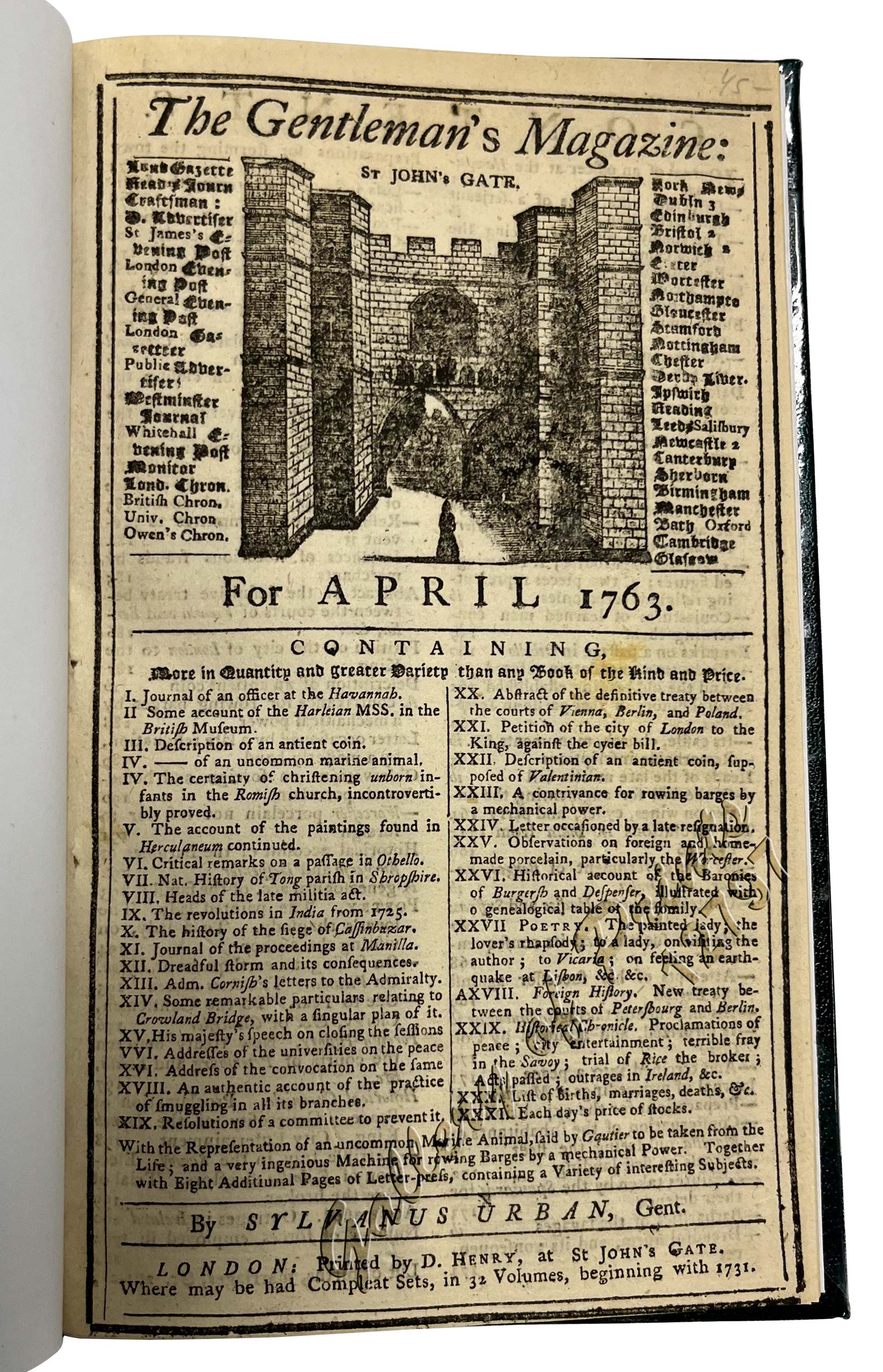 pp. 151-204, modern binding, full title/contents page featuring an engraving of St. John’s Gate, woodcut “Plan for a Bridge at Crowland” and engraved plate “Machine for rowing of Barges against stream”. RARE.