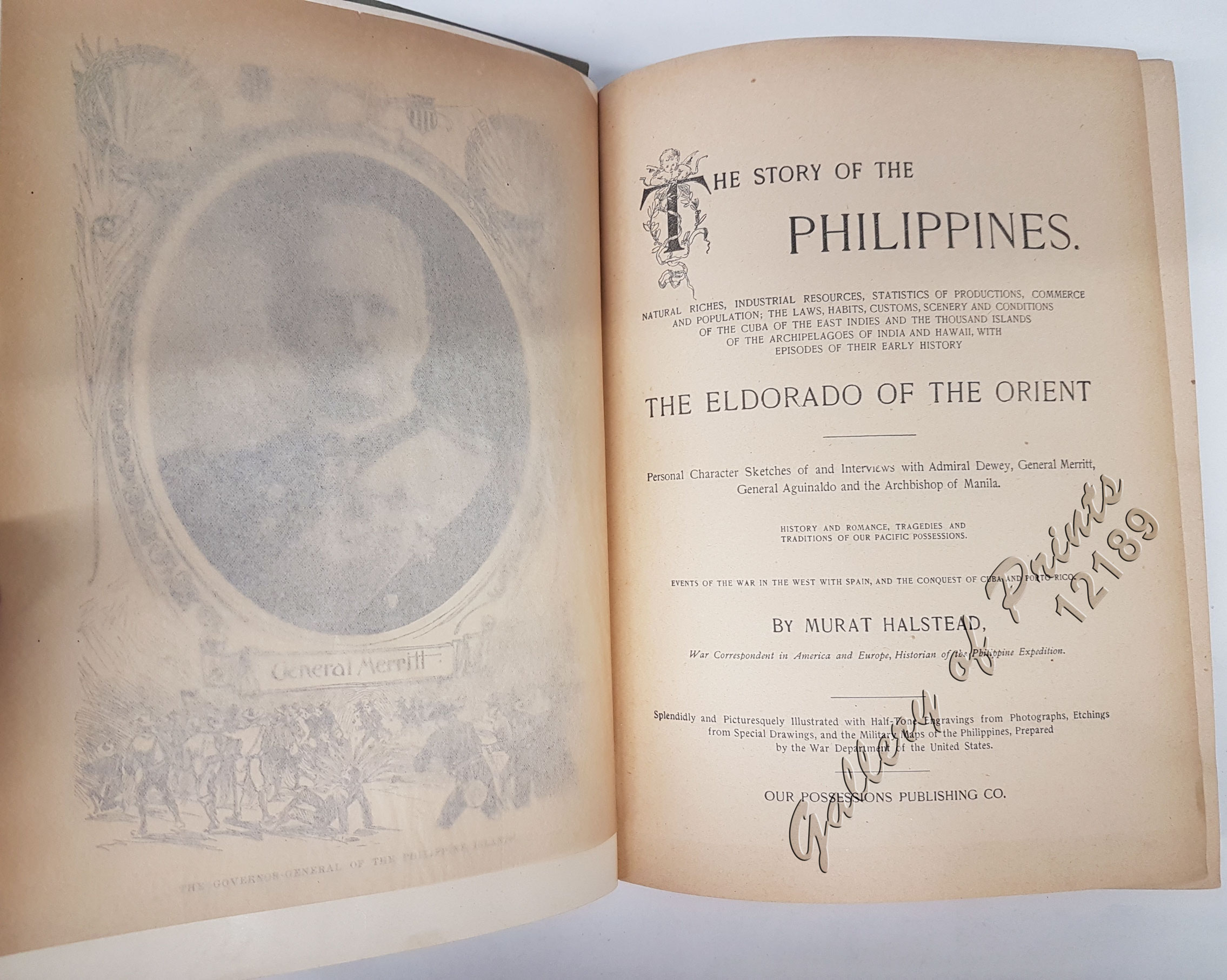 406pp., hardcover, with frontispiece of photo portrait of General Merritt with tissue guard, 130 illustrations, include engravings & photos, lacking Manila map; Called the Eldorado of the Orient, Murat Halstead, a War Correspondent, narrates the natural riches, industrial resources, statistics of productions, commerce & population; the laws, jabits & customs, scenery & conditions of the Philippines including personal character sketches of and interviews with Admiral Dewey, General Merritt, General Aguinaldo & the Archbishop of Manila. Also includes events of the war in the West with Spain, and the conquest of Cuba & Porto Rico.