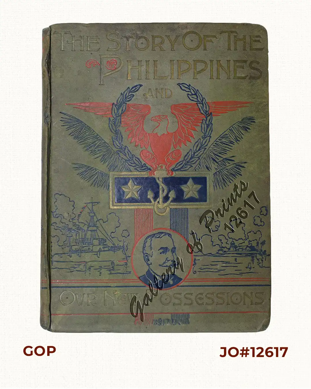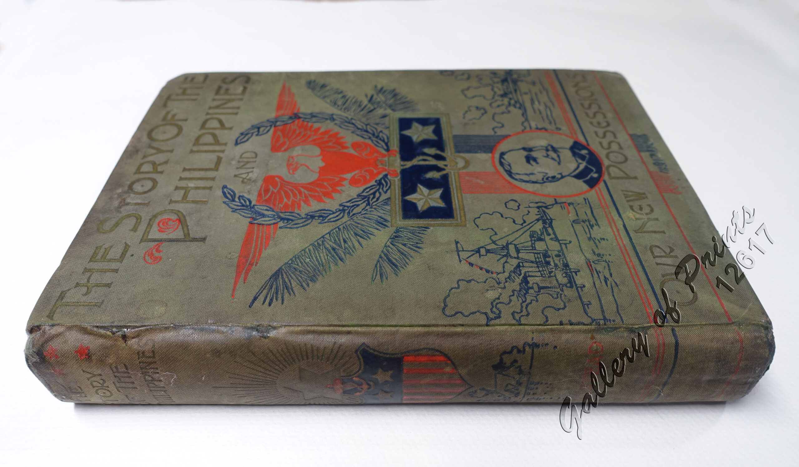 406pp., chapters 1 – 27; hardcover, with frontispiece of photo portrait of General Merritt with tissue guard, 130 illustrations, with engravings, maps including Map of Manila, and photos; This is the edition with 27 chapters. Called the Eldorado of the Orient, Murat Halstead, a War Correspondent, narrates the natural riches, industrial resources, statistics of productions, commerce & population; the laws, jabits & customs, scenery & conditions of the Philippines including personal character sketches of and interviews with Admiral Dewey, General Merritt, General Aguinaldo & the Archbishop of Manila. Also includes events of the war in the West with Spain, and the conquest of Cuba & Porto Rico.