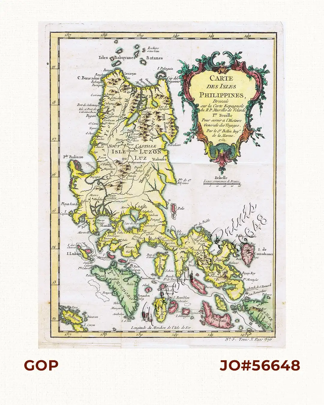 Map from ‘Histoire Generale des Voyages’, octavo edition, no. 3, vol. 10 in 4, p. 376 and p. 377; vol.4 in 8, p. 285; based on Father Murillo de Velarde’s map, the ‘Queen of all Philippine Maps’. Nicolas Bellin (1703-1772) was one of the most important and proficient French cartographers of the mid-eighteenth century. He was appointed the first Ingenieur Hydrographe de la Marine, and also Official Hydrographer to the French king. Bellin produced a substantial number of important separately issued maps, particularly reflecting continuing discoveries and political events in the Americas.