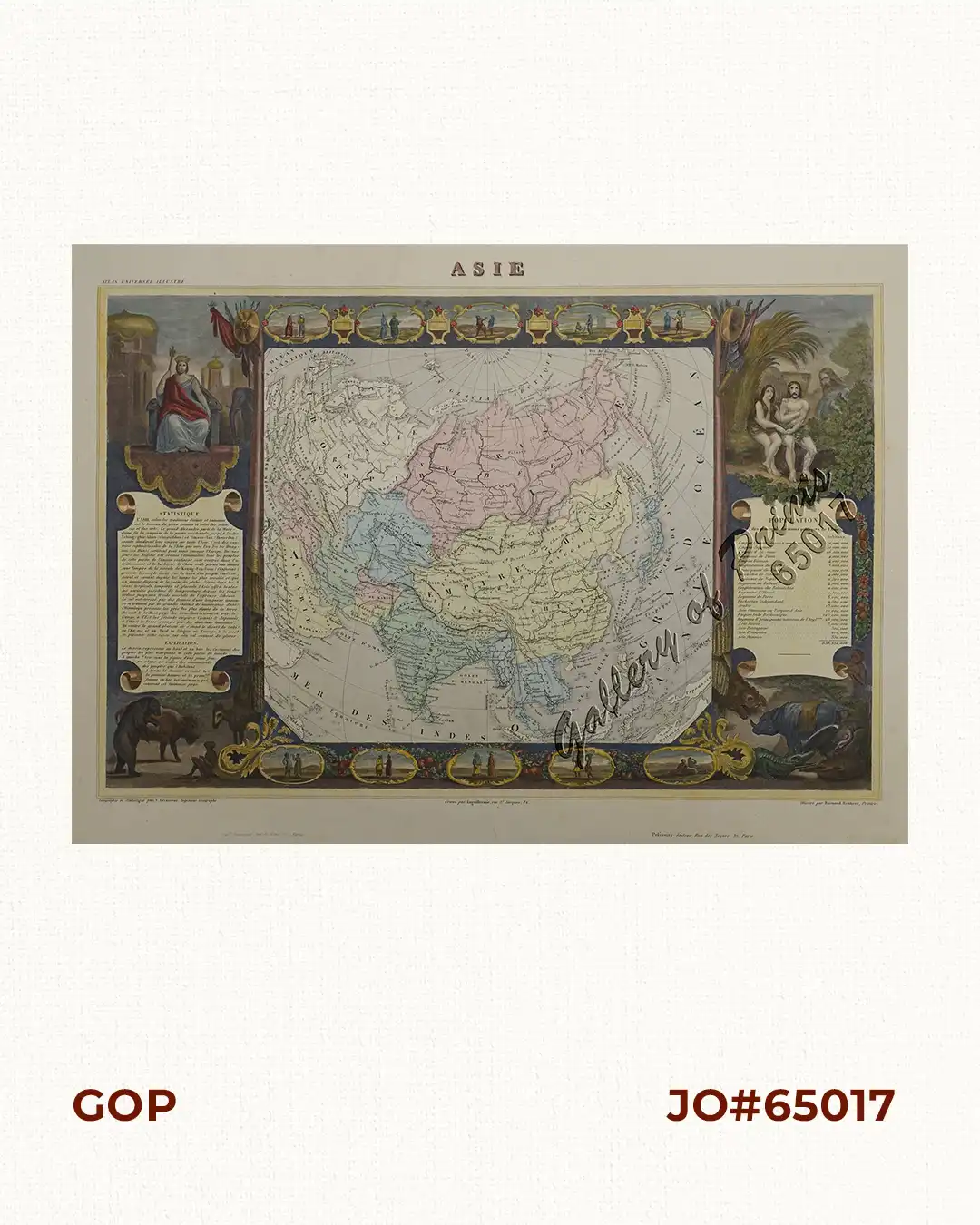 Map of the Asian continent surrounded by steel engraved vignettes depicting costumes of the various peoples of Asia, Adam and Eve, and seceral exotic animals, This map was illustrated by Raimond Bonheur, father of the famous painter Rosa Bonheur.
