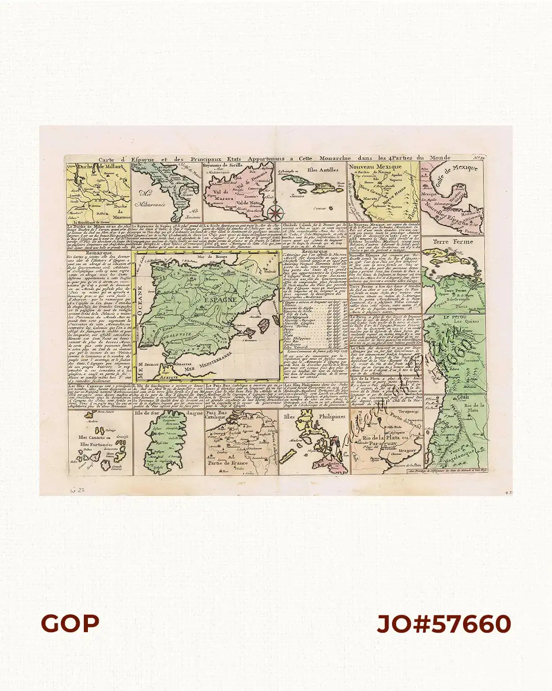 Map from the ‘Atlas historique….’, plate no. 34, originally 1, then extended to 7 vols. The colonial power SPAIN with the large central map surrounded with small depictions of all colonies.
