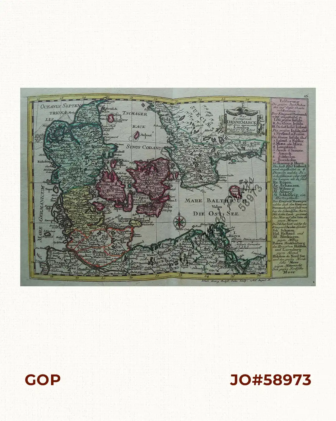 RARE original hand-colour copper engraving, double-page chart map of Denmark, stretching from Northern Germany (Schleswig-Holstein) till the Southern tip of Sweden, with small cartouche, a compass rose, and an explanatory text and directory on the right of the map, from the “Atlas Minor ex Tabulis Geographicis…” pl. 16. Map engraved in 1786 as shown in lower right.