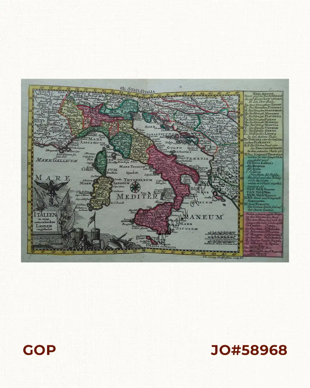 RARE original hand-colour copper engraving, double-page chart map of Italy with explanatory text and directory on the right of the map from the “Atlas Minor ex Tabulis Geographicis…” [without plate no.]. with engraving by Joh. Georg Probst’s son.