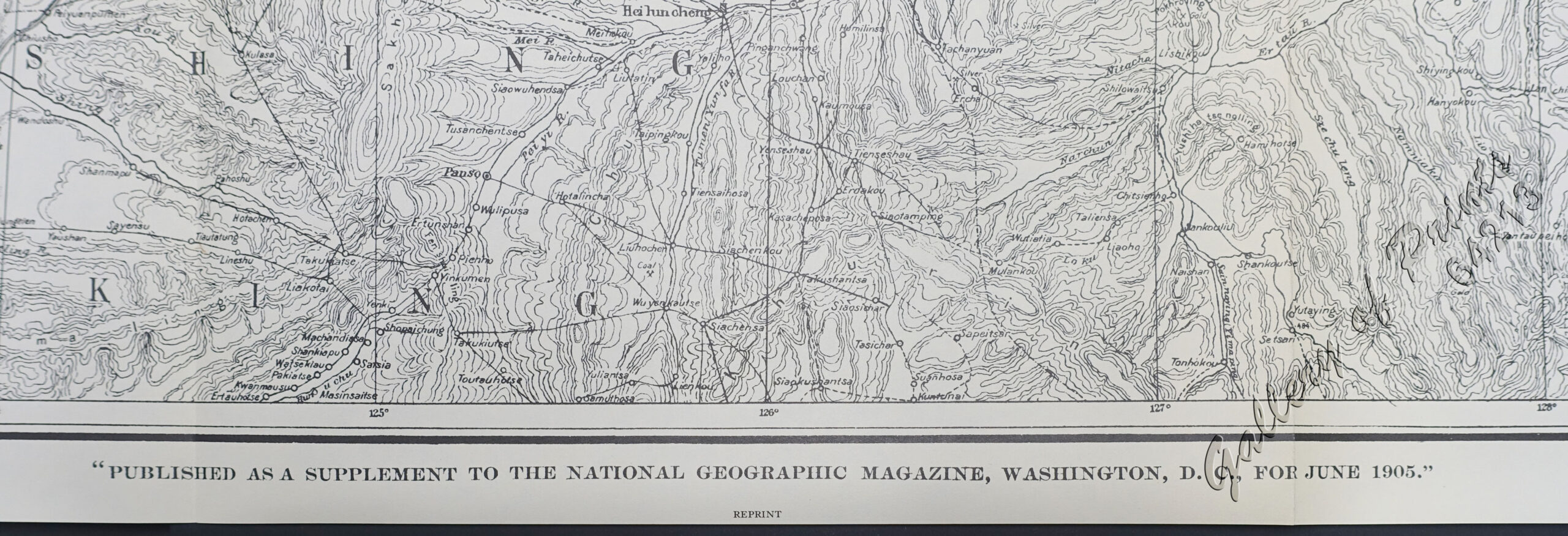 The Trans-Siberian Railway, completed in 1903, is a network of railways connecting the Russian Far East and the Sea of Japan with Moscow. It is the longest railway in the world with branch lines to China through Mongolia and Manchuria. This beautifully rendered antique map of the region from Vladivostok to Kirin and Harbin was published by National Geographic in June of 1905.