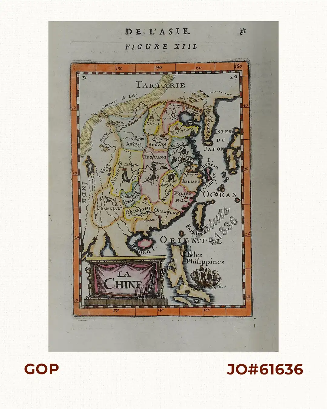 Map from the original French text edition of “Description d’Univers…” – Fig. 13, pl. 31; A charming small map of China, Taiwan, the Philippines, Korea, and Kyushu (Japan). Allain Manneson Mallet (1630-1706) was a well travelled military engineer and geographer who worked in 17th century France under King Louis XIV. Mallet’s work covered all continents in several volumes.