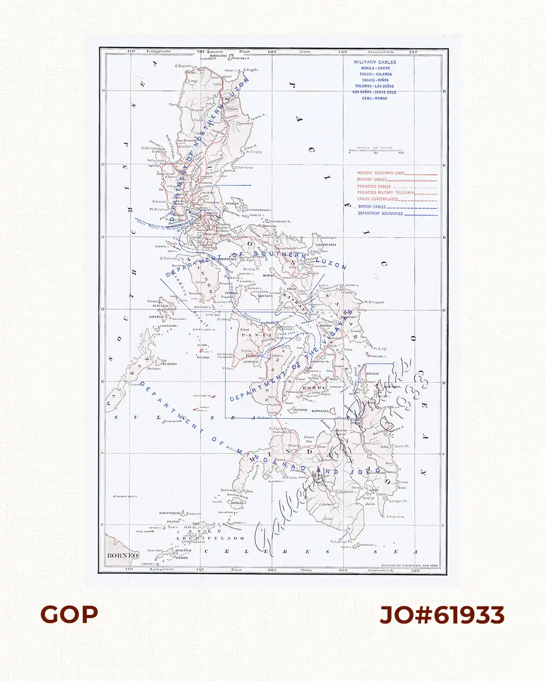 Lithograph map of American Military Cables in the Philippines, covering Luzon and the Visayas. SCARCE