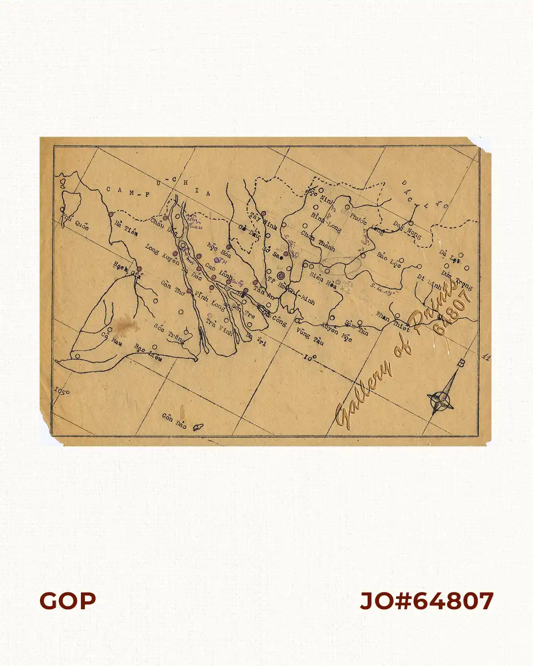 map of Mekong Delta from anonymous publication, drawn in black ink and typewritten text of names.