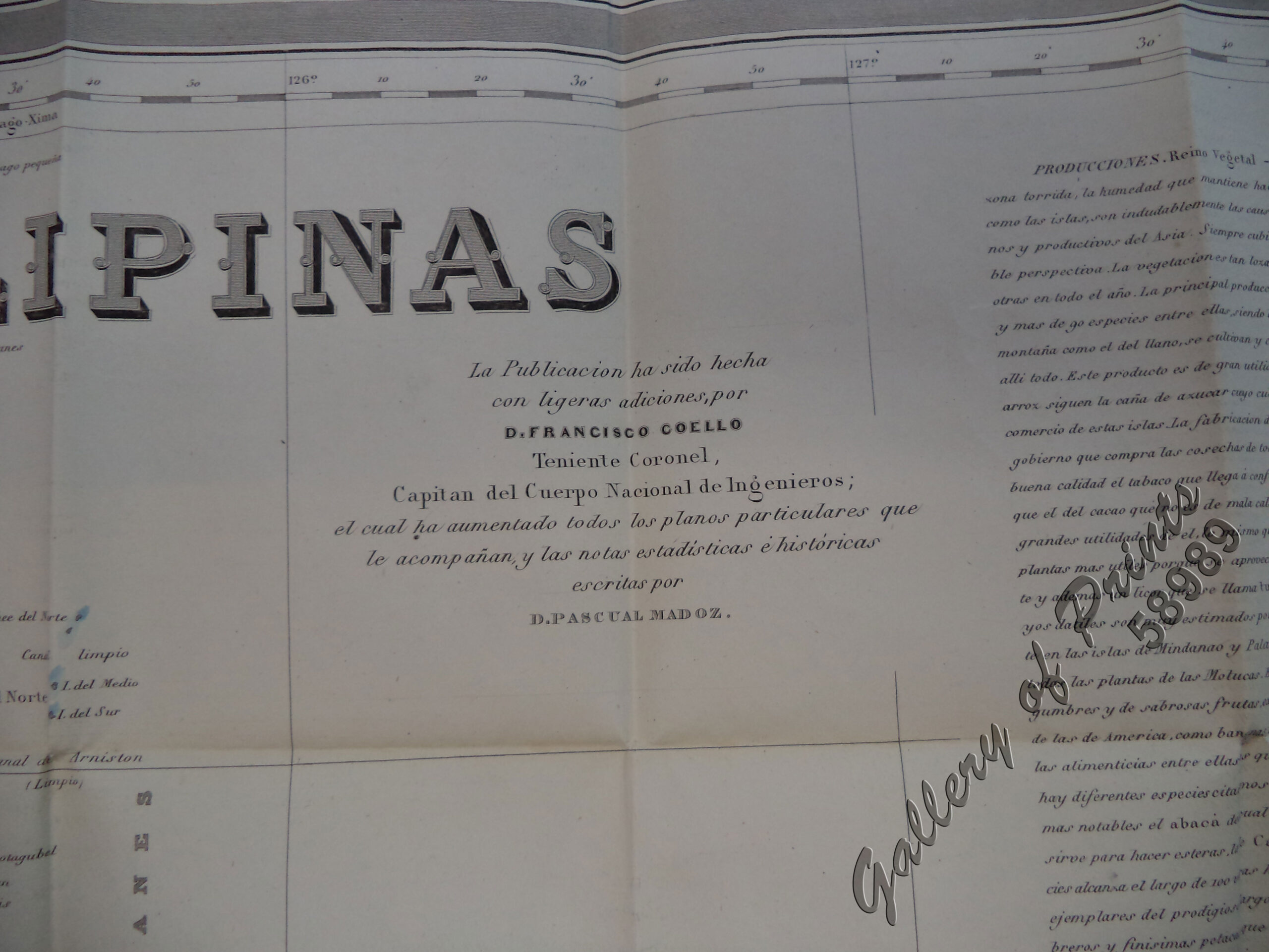 The work is part of Coello’s unfinished mapping project, the ‘Atlas de España y sus posesiones de Ultramar’ as part of the ‘Diccionario geográfico-estadÃstico-histórico’, published in Madrid.