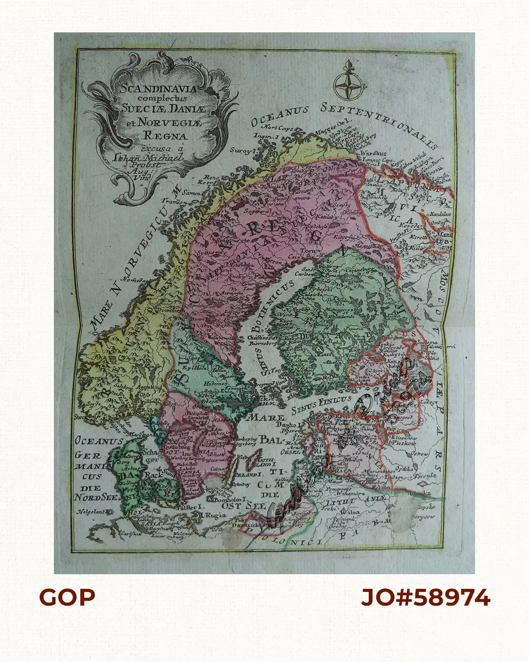 RARE original hand-colour copper engraving, double-page chart map of the Scandinavian countries from the “Atlas Minor ex Tabulis Geographicis…” [without plate no.].