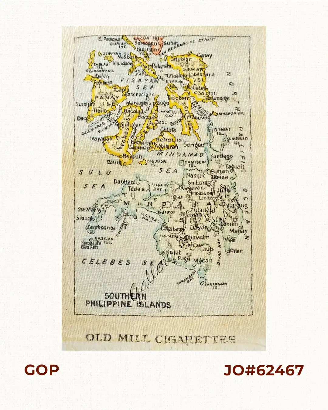 original colour map on thin silk. One of the extremely few maps of the Philippines on silk. This one issued by the American Old Mill Cigarettes Company. A true collector’s item.