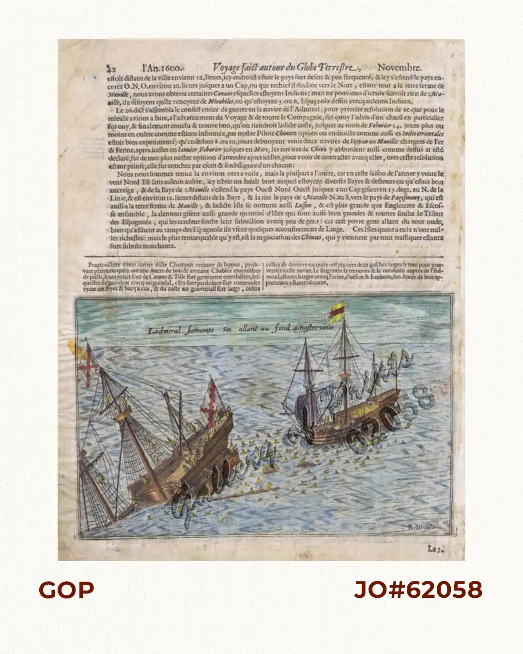A dramatic view from van Noort’s book “Description du penible voyage fait entour de l’universe ou globe terrestre…” First (?) French edition of this classic exploration narrative published in Amsterdam by Cornille Claessz [Cornelis Claesz (1551-1609)]. This is the story of the fourth ship (and the first Dutch one) to circumnavigate the world (1598-1601), after Magellan, Drake, and Cavendish. It is the translation of the original “Beschryvinghe vande voyagie om den geheelen werelt cloot”, published in 1602. In November and December 1600, Oliver van Noort (1568-1611) occupied the area around Corregidor Island. His ships ‘Mauritius’ and ‘Eendracht’ were engaged in pirate activities on the commercial traffic sailing to and from Manila. The Spanish dispatched a party to engage van Noort at Corregidor, which resulted in a battle fought on December 14, 1600. Plate shows the sinking Spanish flagship of Antonio de Morga, the ‘San Diego” and its drowning crew off Manila Bay near Fortune Island; it was retrieved only 1992-1995 as nobody suspected the battle area to extend this far South of Manila Bay.