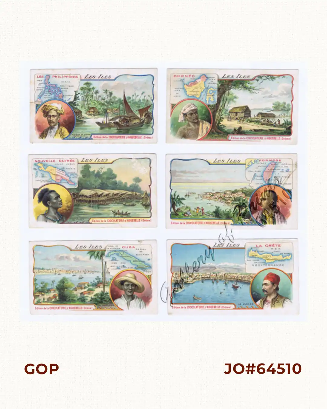 ![Les Iles [The Islands] 1) Les Philippines Rivière de Davao (Mindanao) [Davao River]. 2) Borneo Un Village à Borneo [A Village in Borneo]. 3) Nouvelle Guinée Village Lacustre de Sowek [Sowek Lake Village]. 4) Formose [Taiwan] Ta-kao. 5) Cuba La Havane [Havana]. 6) La Crète La Canée [Chania].](https://galleryofprints.shop/wp-content/uploads/2024/09/JO64510-Chocolat-dAiguebelle-c1910-Les-Iles.webp)