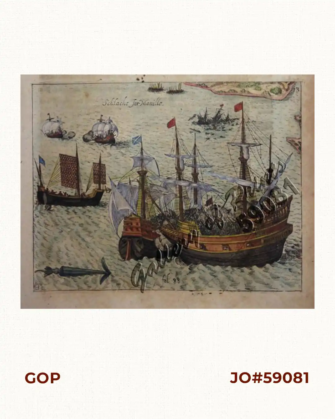 EXTREMELY RARE view from ‘Neue Welt und Amerikanische Historien’. Engraved depiction of the first European sea battle in the Philippines, between Antonio de Morga and Admiral van Noort in 1600.