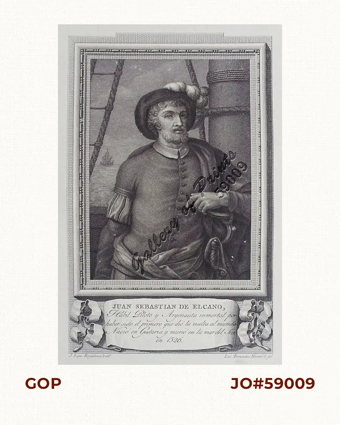 VERY RARE portrait of Juan Sebastian del Cano, then Elcano [1486-1526], Ferdinand Magellan’s navigator. After Magellan was killed in the Philippines he brought one of Magellan’s ships, the Victoria, back to Sanlucar de Barrameda with 18 surviving men, arriving on Sept. 6, 1522, after a journey of 3 years and 1 month. Thus, Elcano rather than Magellan, has the distinction of being the world’s first circumnavigator.