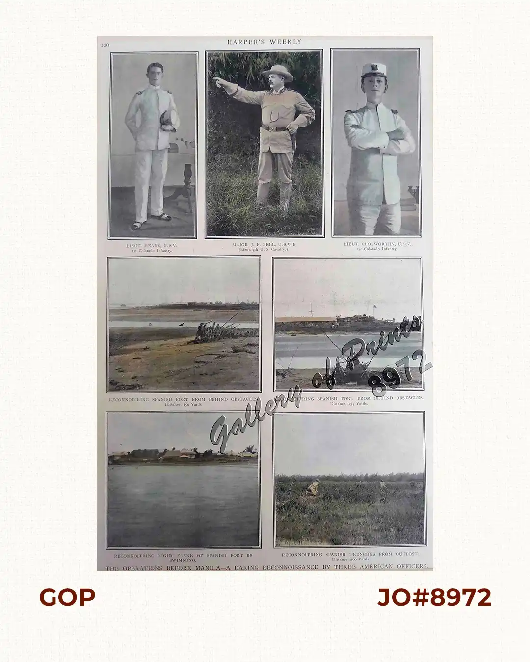 The Operations Before Manila – A Daring Reconnoissance by Three American Officers. 1. Lieut. Means, U.S.V., 1st Colorado Infantry 2. Major J.F. Bell. U.S.V.E., (Lieut. 7th U.S. Cavalry) 3.Lieut. Clotworthy, U.S.V., 1st Colorado Infantry 4. Reconnoitring Spanish Fort from Behind Obstacles. ( Distance, 150 Yards) 5. Reconnoitring Spanish Fort from Behind Obstacles. ( Distance, 137 Yards) 6. Reconnoitring Right Flank of Spanish Fort by Swimming 7. Reconnoitring Spanish Trenches from Outpost. (Distance, 300 yards)