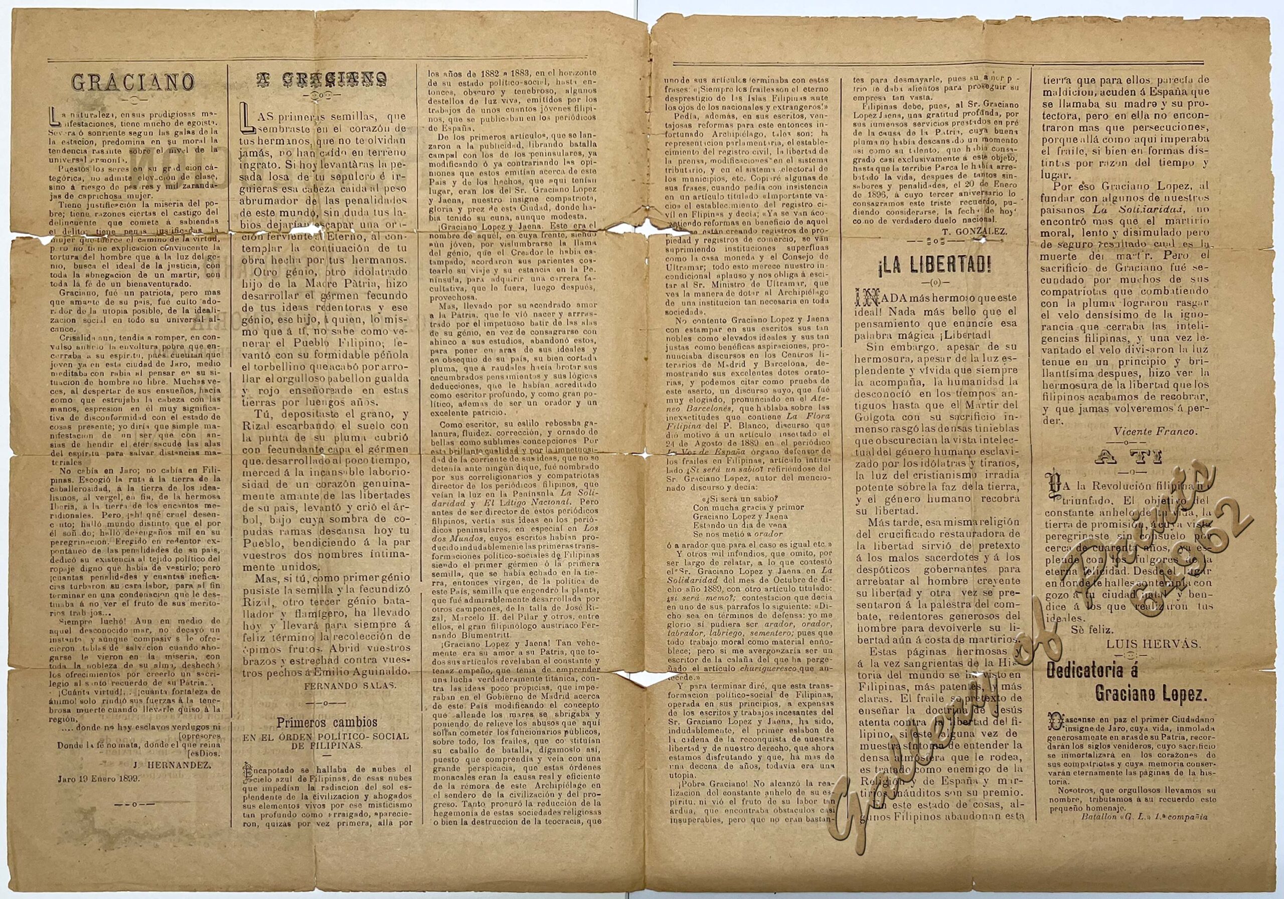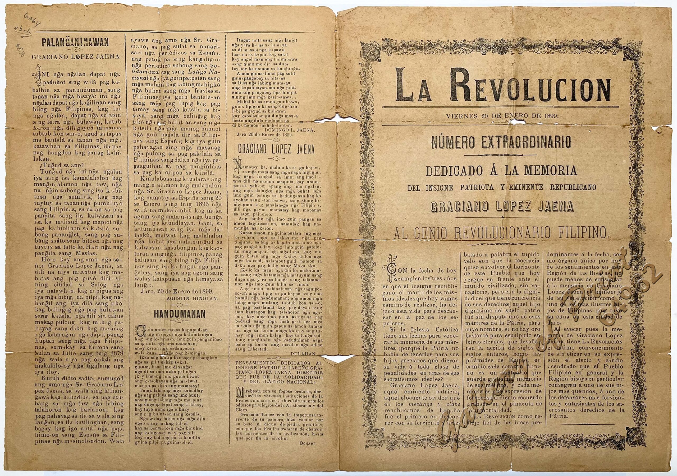 A special issue of La Revolucion, one of many newspapers issued in support of the Filipino revolutionaries fighting against American colonialist forces in the Philippines at the turn of the 20th century. The present issue is “dedicated to the memory of the distinguished patriot and eminent republican” Graciano Lopez Jaena who was born in Jaro in 1856.