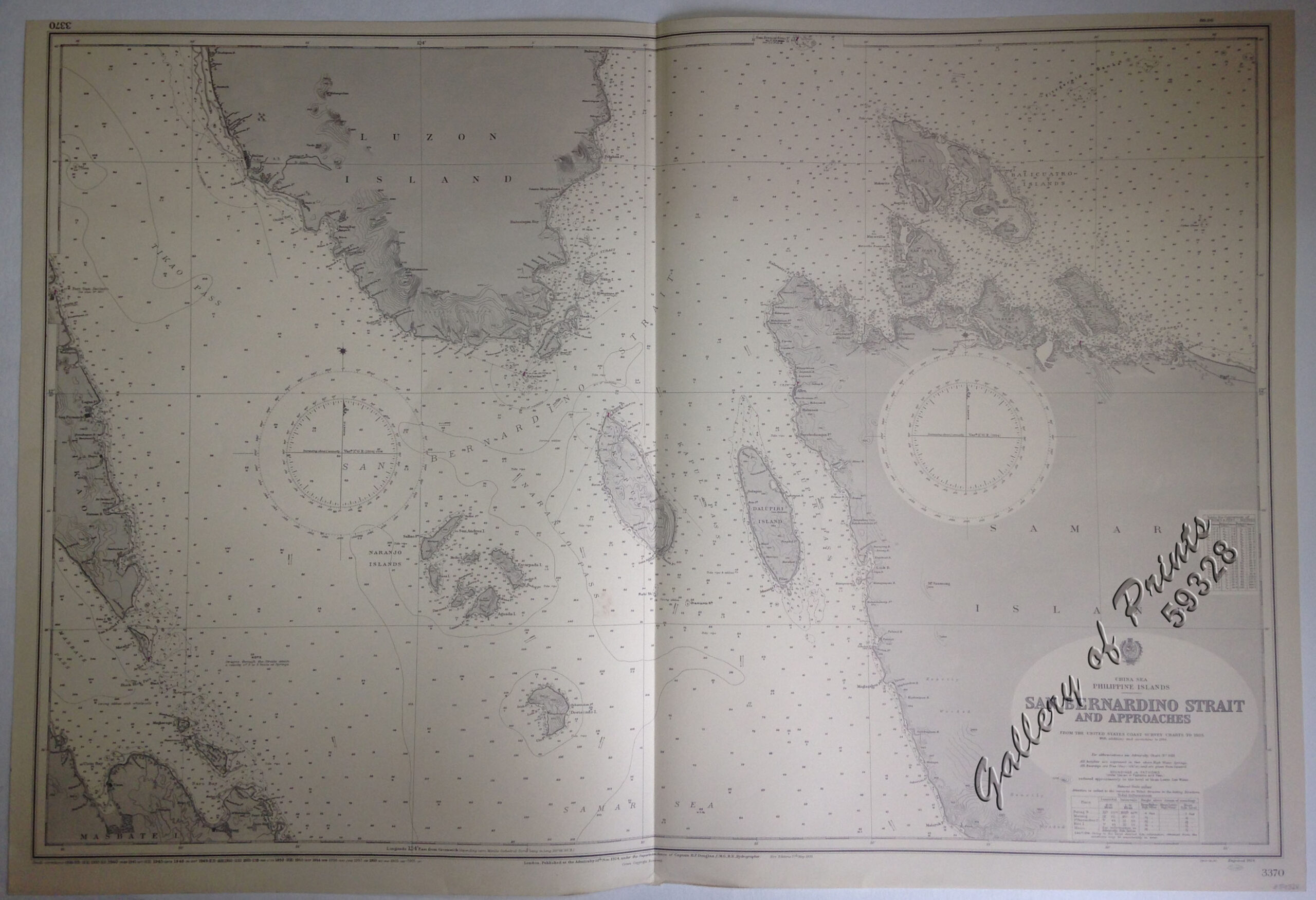 lithograph. Map#3370. New editions 17th May 1935. Small corrections 1930[many subsequent years stated till] 1966 – Z/c 1957. Seal of the Hydrographic Office – Â Sea Roses with 360 degrees in middle left and right on top of the title.