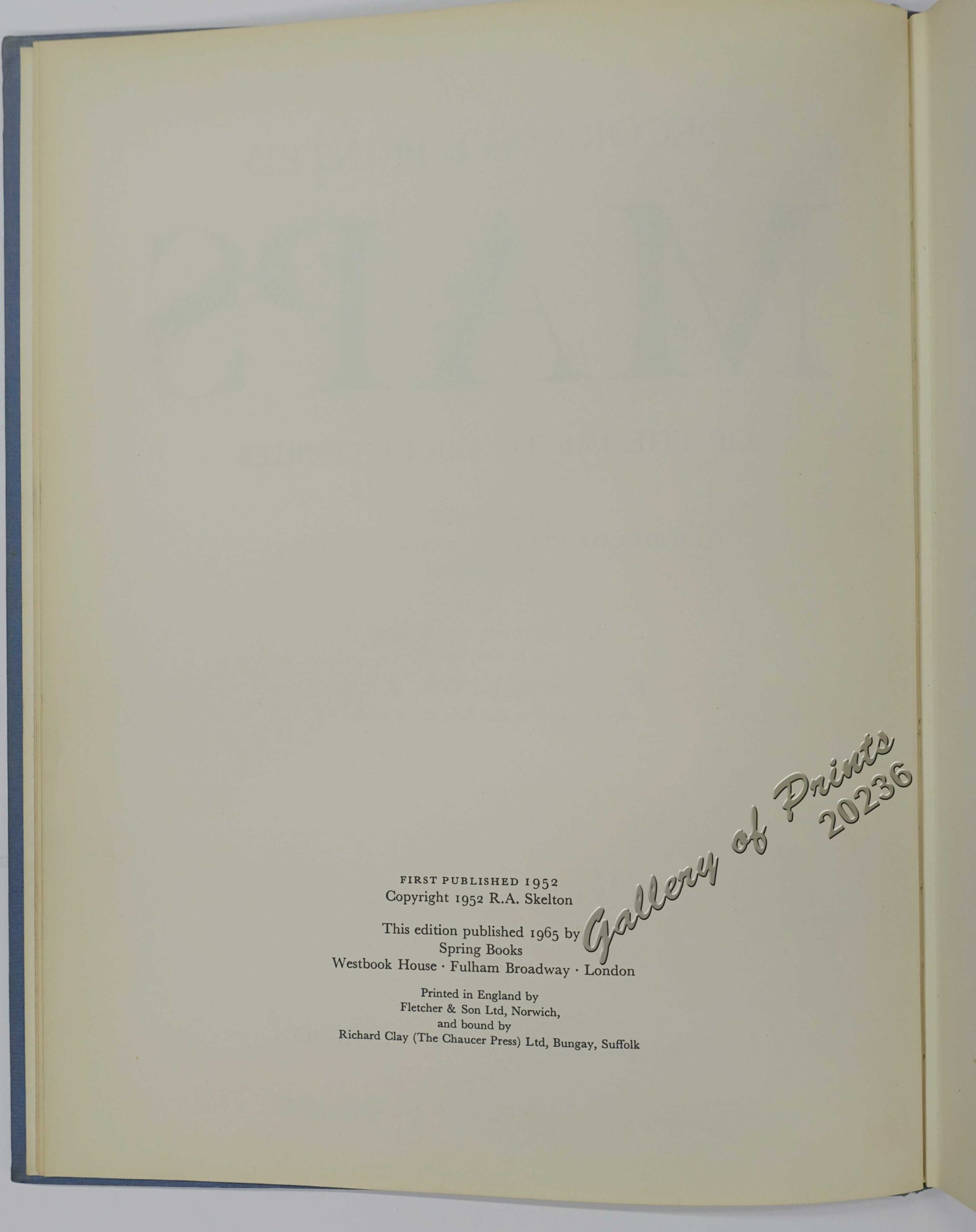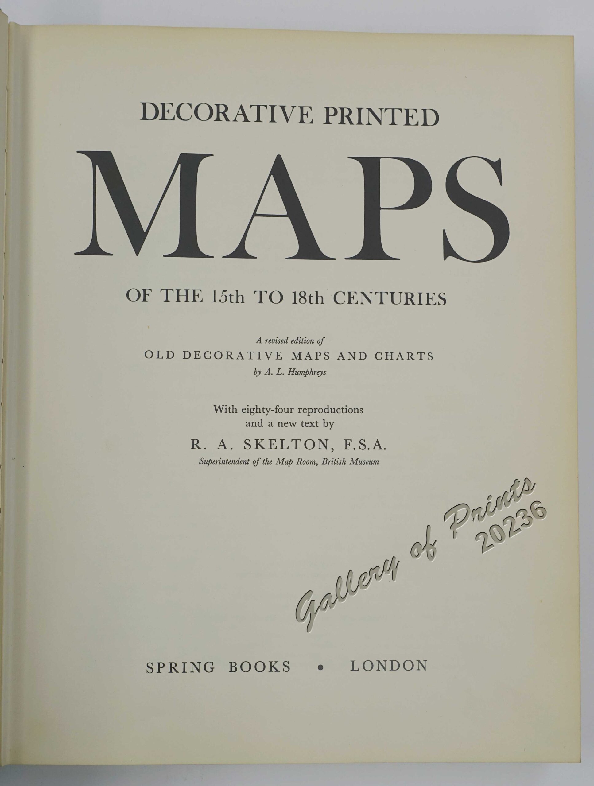 A revised edition of A. L. Humprey’s Old Decorative Maps and Charts; Contains 84 reproductions and a new text by R. A. Skelton, F.S.A., superintendent of the Map Room, British Museum. First published 1952. This edition published 1965.
